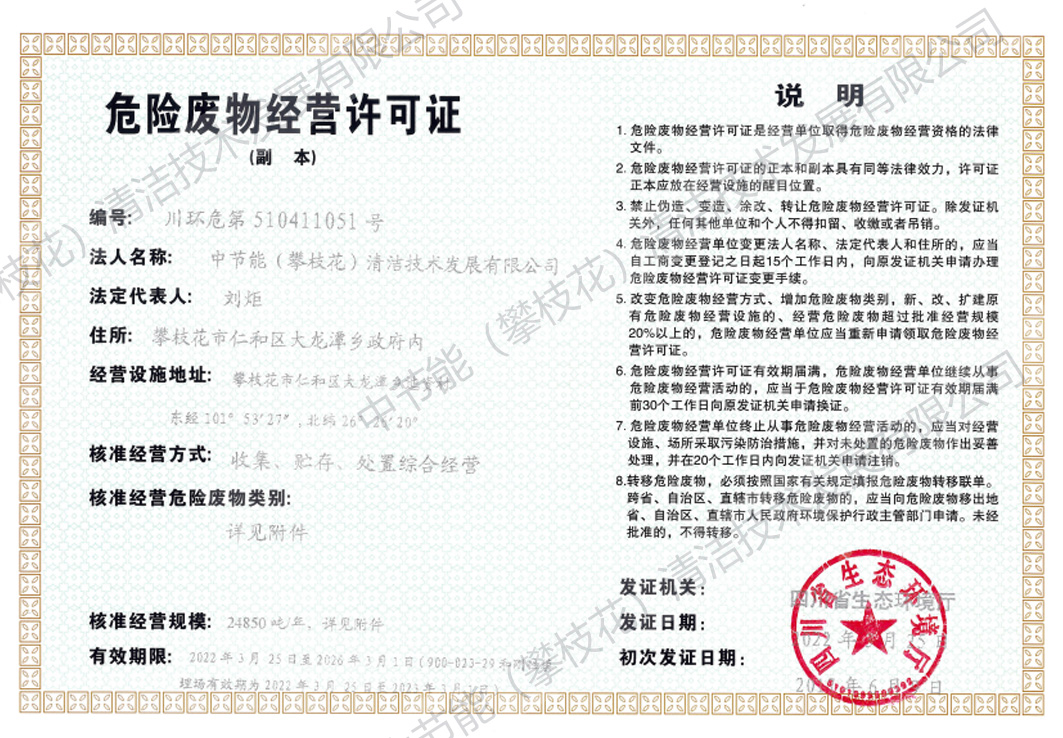 中節(jié)能(攀枝花)清潔技術(shù)發(fā)展有限公司(以下簡(jiǎn)稱(chēng)公司)成立于2008年5月,注冊(cè)資金1.6519億元。公司由中節(jié)能清潔技術(shù)發(fā)展有限公司和攀枝花市產(chǎn)業(yè)投資經(jīng)營(yíng)有限責(zé)任公司共同持股,并由中節(jié)能清潔技術(shù)發(fā)展有限公司控股經(jīng)營(yíng)。公司投資建設(shè)和運(yùn)營(yíng)的攀枝花市危險(xiǎn)廢物處置中心項(xiàng)目是全國(guó)統(tǒng)籌部署的全國(guó)31個(gè)危險(xiǎn)廢物綜合處置中心項(xiàng)目之一,位于攀枝花市仁和區(qū)大龍?zhí)多l(xiāng)迤資村華賣(mài)社,核準(zhǔn)處理原生廢物2.425萬(wàn)噸/年,可對(duì)43大類(lèi),447項(xiàng)(醫(yī)療廢物)進(jìn)行安全處置。