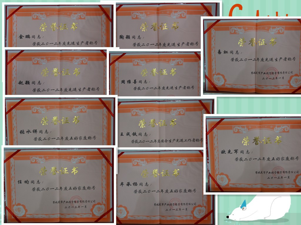 榮獲二○一二年度“先進生產(chǎn)者”稱號:陶穎、金鵬、周維善、趙穎、易虹