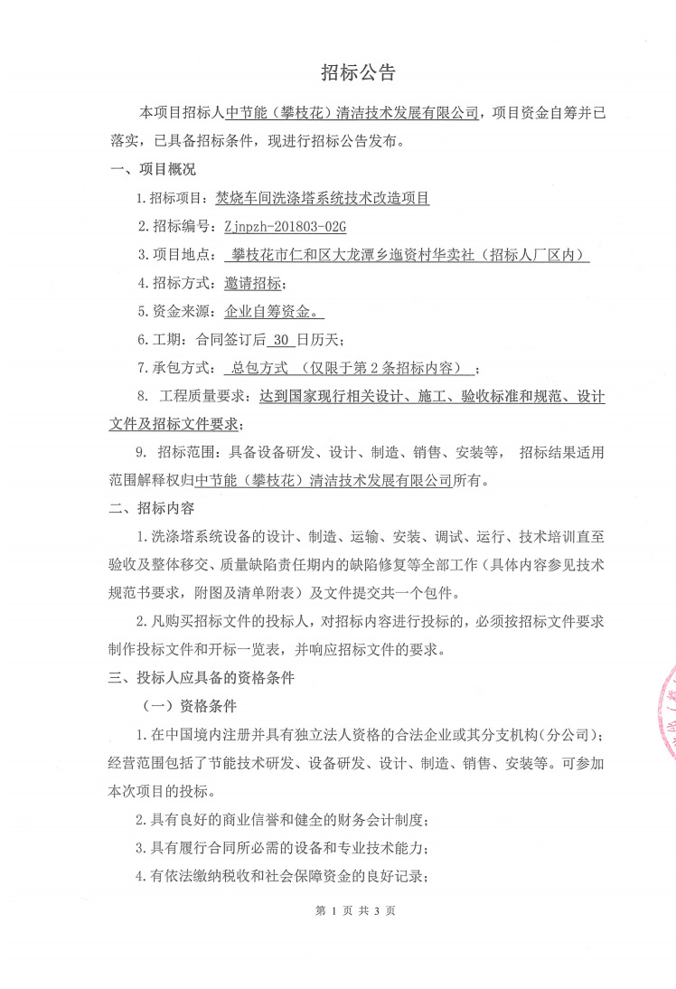 焚燒車(chē)間洗滌塔系統(tǒng)技術(shù)改造項(xiàng)目招標(biāo)公告