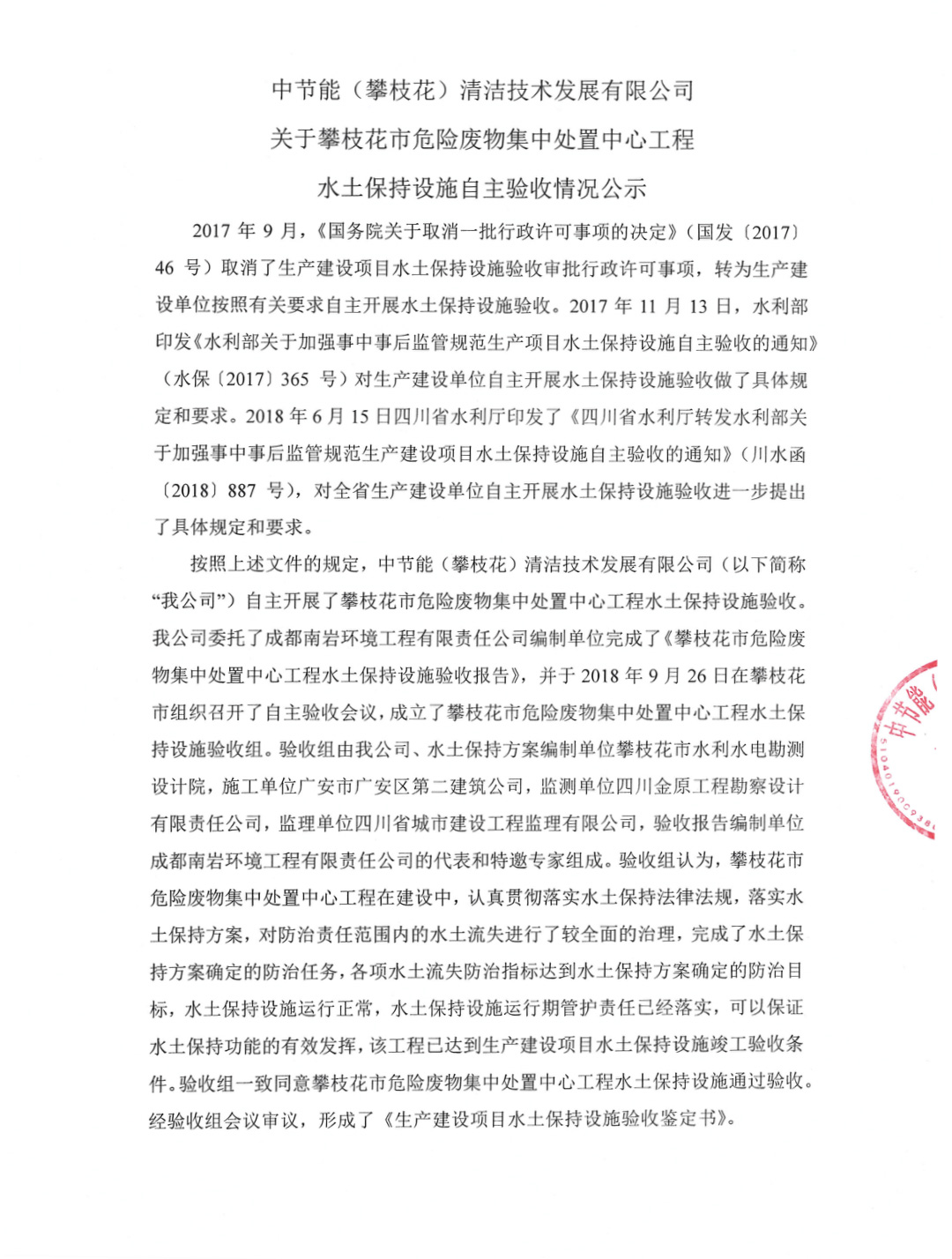 攀枝花市危險廢物集中處置中心工程水土保持設施自主驗收情況公示